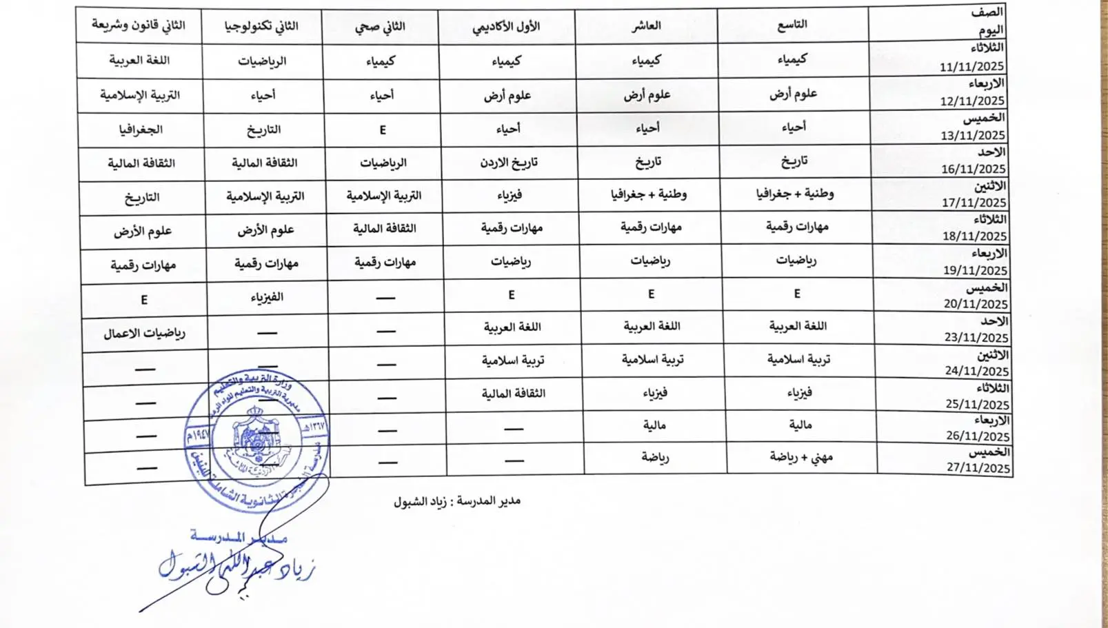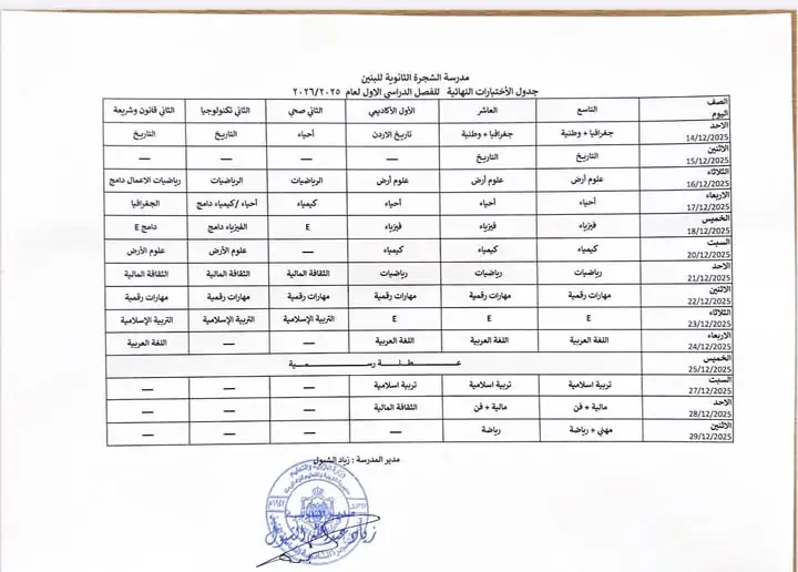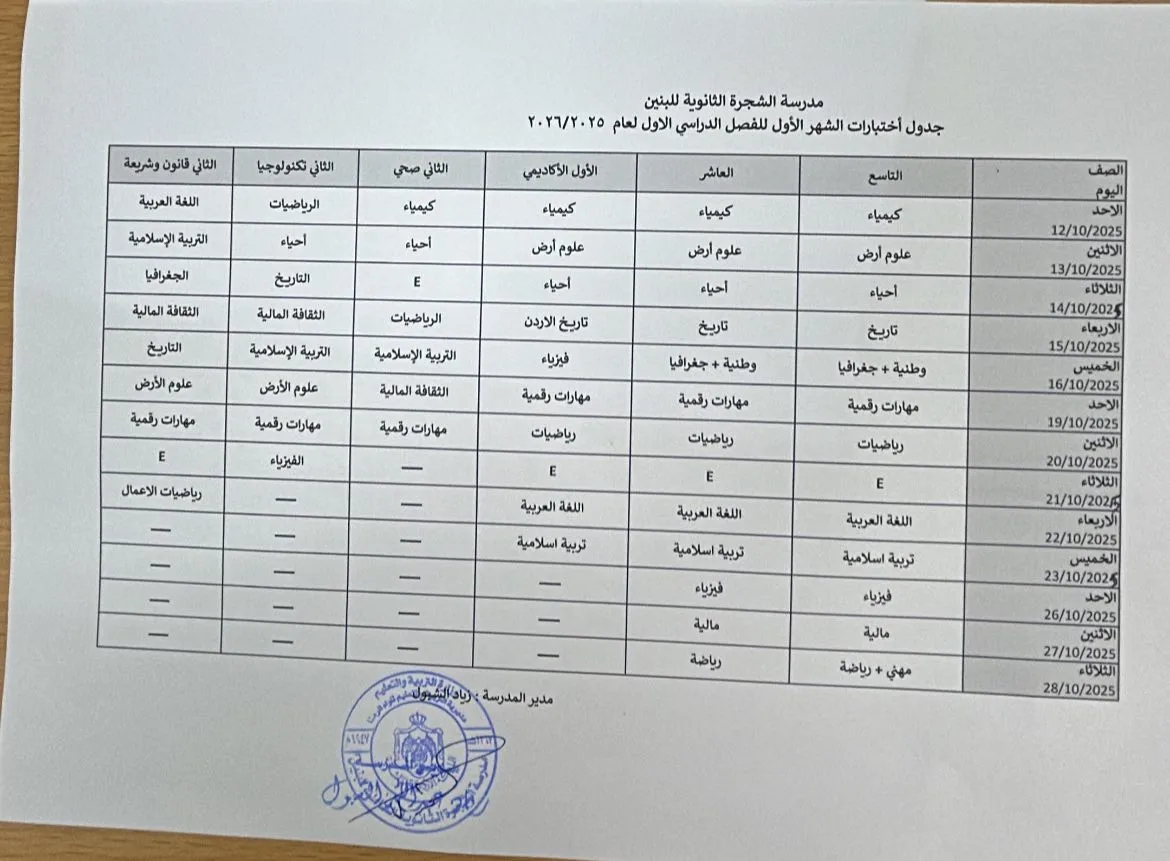 📅 جدول الامتحانات الشهرية - الفصل الأول
