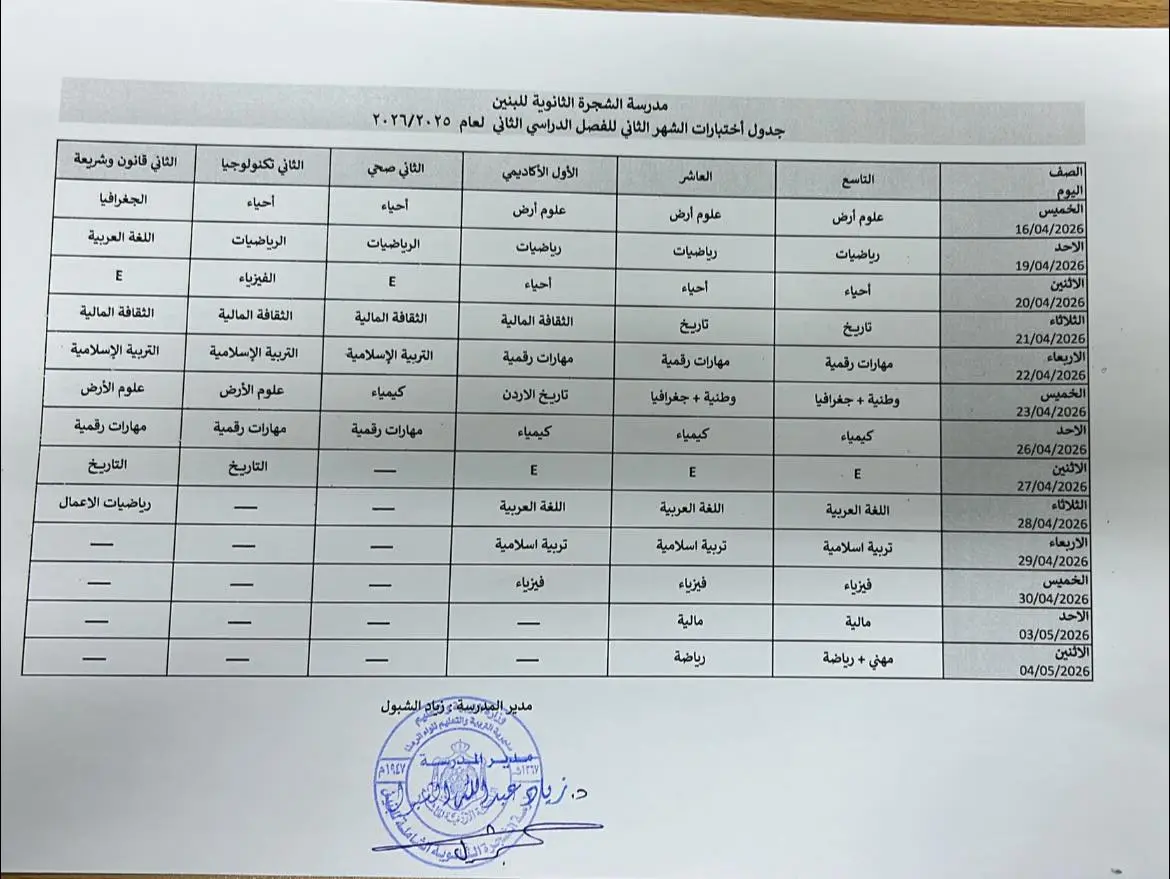 📅 جدول الامتحانات الشهرية - الفصل الثاني